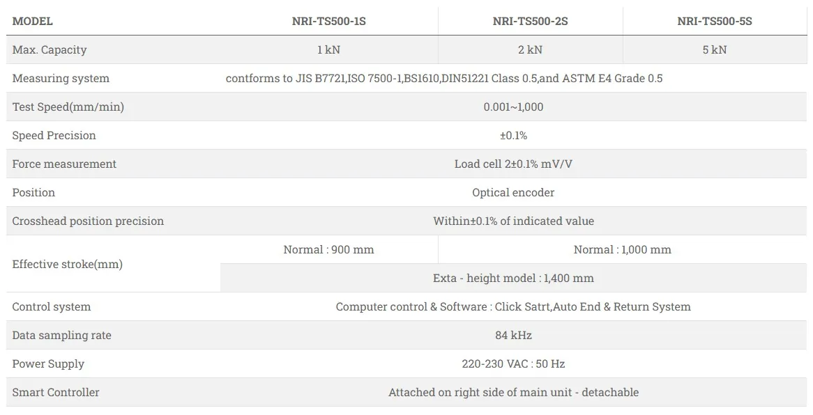 The NRI-TS500-XS Single Column Universal Testing Machine is designed for precision tension and compression tests up to 5 kN. Featuring a robust linear motion guide, servo motor, and high-efficiency planetary gearbox, it delivers smooth, low-noise performance. Compatible with a wide range of accessories, it meets various international standards (ASTM, ISO, EN, GB/T) for testing plastics, wires, bars, biomaterials, adhesives, and more — powered by advanced NRI V.5 software for accurate data analysis.